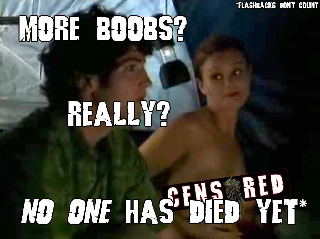 Oh yes, did I mention that the kids are quite aware of the tales of the Camp Utopia bloodshed? Well, they are! Their first night in the woods the lead male, Bizzaro Kevin Bacon (Collin Stark), relates the tale of the massacre to the others as the sit around the campfire. From a story perspective, this sequence is meant to inform the New Girl character of the local legends. From a filmmaking perspective, this sequence is meant to inform the audience of the local legends. The only problem is, they already showed us everything that happened in the flashback sequence that opened the film. Even worse, all the footage they use to overlay the campfire story is take directly from that flashback sequence. Oh joy, the filmmakers get to pad out their hour and twenty minute run-time by showing me the same footage twice!