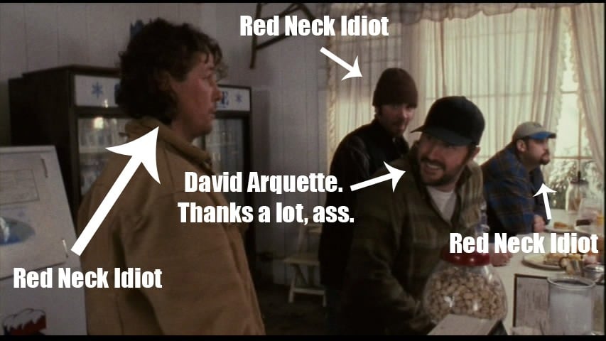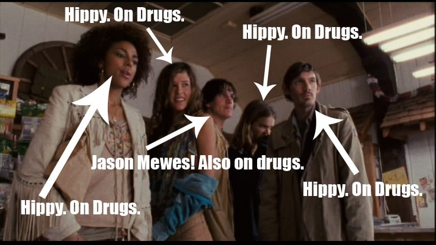Like I said, it sounds good. I, for one, love a little socio-politcal commentary in my horror flicks from time to time. George Romero was a genius at this game. David Arquette, not so much. The first problem? None of the characters are likable. The drugged up hippies are one dimensional stereotypes in the worst possible way. They literally have no purpose in the film other than show up, do drugs, and die. All of the non-hippy characters are portrayed as deep south red neck hicks who do nothing but make life miserable for the hippies. Even the sheriff assigned to provide protection at the event doesn't believe the hippies when the shit hits the fan because he dismisses them as drugged up idiots. Simply put, there isn't a single intelligent, likable character in the movie.